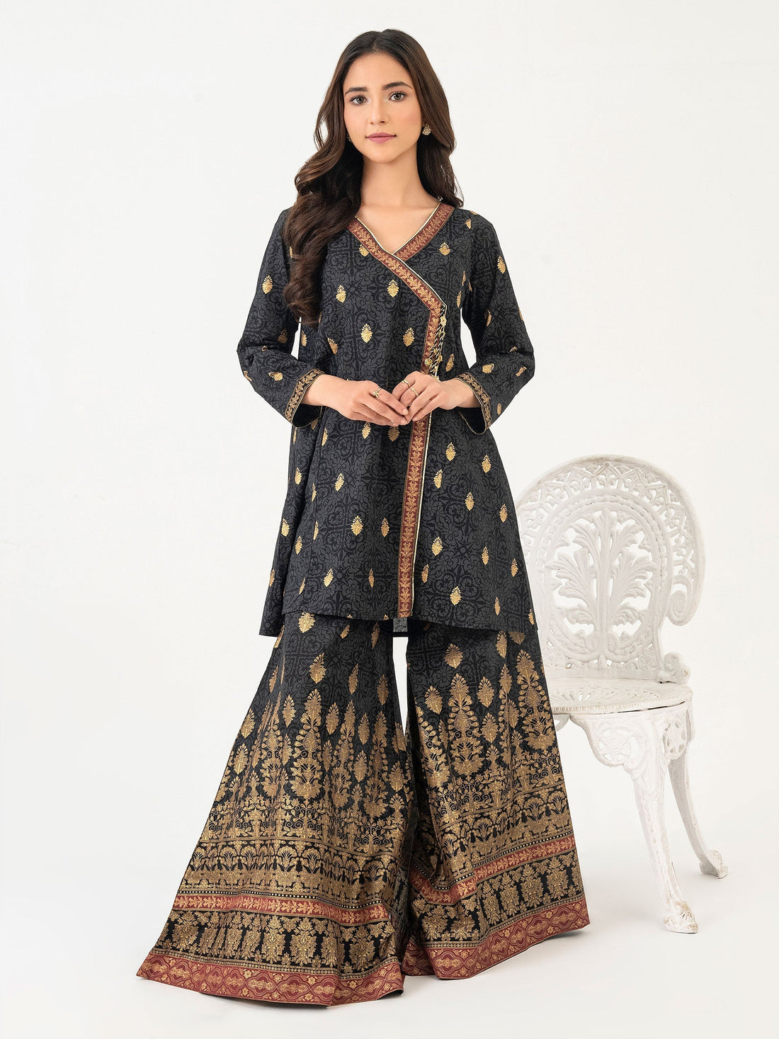 Angrakha Gold paste print angrakha frock Fabric: Lawn Sharara Gold paste print sharara with elasticized...
