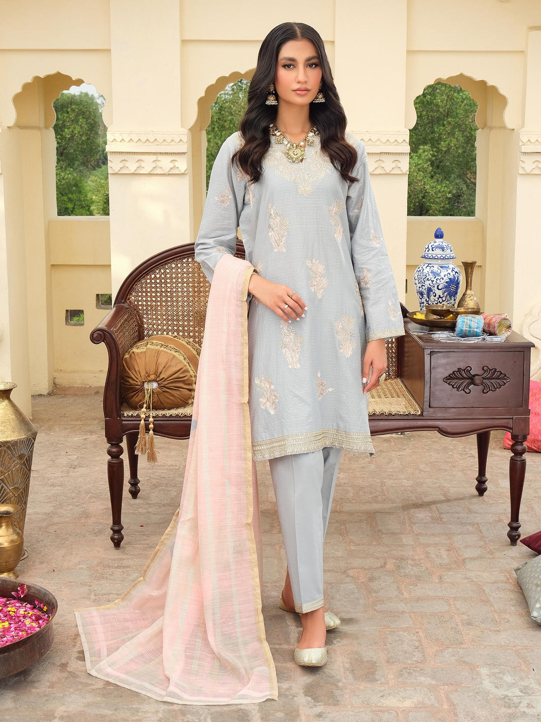 Shirt Dyed embroidered shirt Fabric: Lawn Dupatta Printed dupatta Fabric: Zari Shalwar Dyed shalwar with...